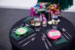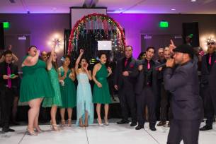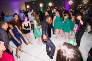 Besides all the amazing performances, these two also created most of the wedding from scratch. They build an amazing floral arch that they wove with lights. Stina also made her bouquet with pins and ribbons and even had a special pin that belonged to her grandmother. For each of the tables, they build custom display that featured a different style of dance they loved and had maracas and tambourines for their guests to add even more music into the party! They even had their special DJ mascot Dino in their wedding as the ring bearer! What a special and one of kind wedding!