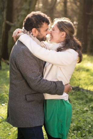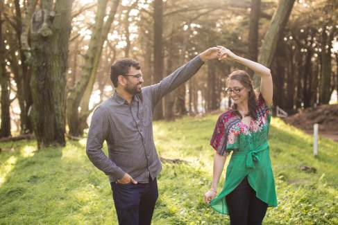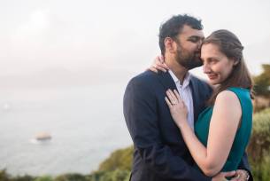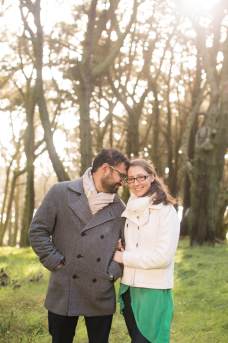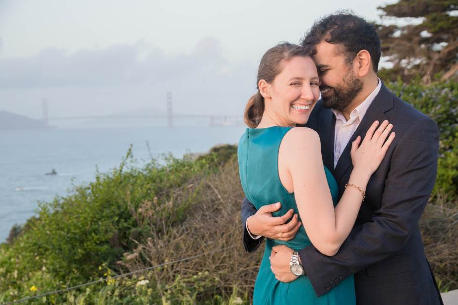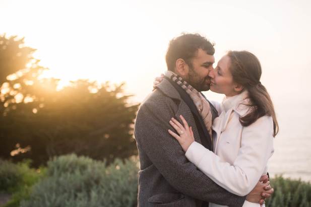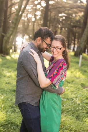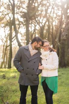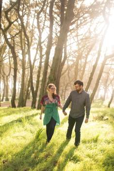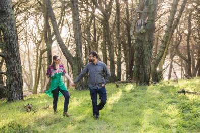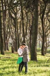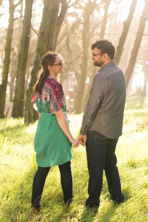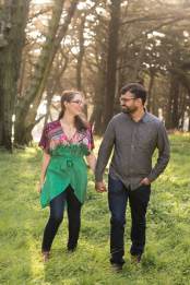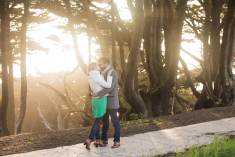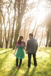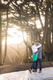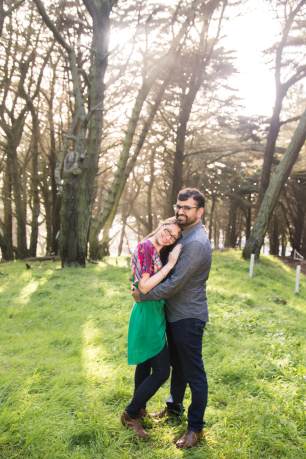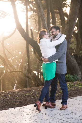 What an amazing session with Maeva and Arvind! They chose Lands End in San Francisco for their engagement portrait and we were blessed with dreamy golden rays of sunshine in an almost always foggy location. For their session, they wanted a forest look so we found a spot on a trail just above the upper parking lot. While the lower parking lot and the lower trails are always crowded, this spot was totally empty except for song birds. It was like something out of a fairy tale! Even though it was a very chilly day, the sunshine makes everything look so much warmer!