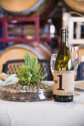 For their centerpieces, they grew their own succulents in their garden. What a creative idea! They also used decorated wine bottles and used them as table numbers and used wine corks as escort cards- perfect for their winery wedding!