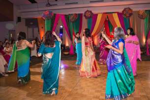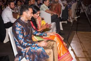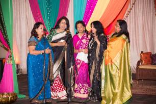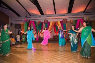 Muskan and AJ celebrated their Sangeet night at the India Community Center in Milpitas last week in a gorgeous and fun-filled evening. They transformed the inside of the center with brightly colored swaths of fabric, floating candles, marigold flower chains, and lovely lanterns. The colors didn’t stop there! All the guests were dressed in a rainbow of colors. Muskan and AJ looked fabulous in the colors they picked out. AJ’s dark blue outfit complemented Muskan’s red, gold and multi-hued sari perfectly!