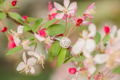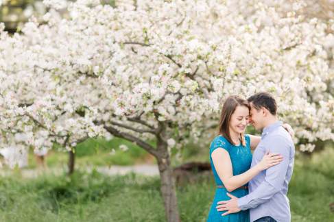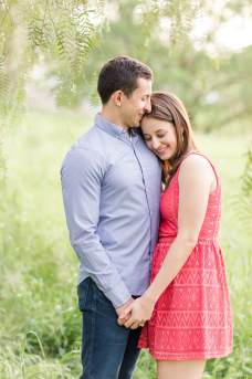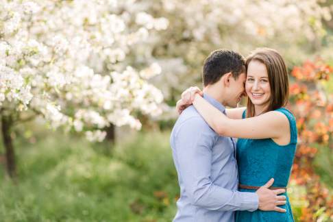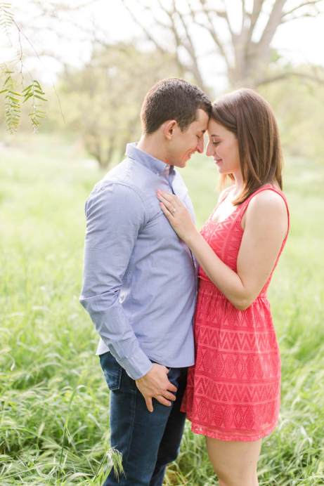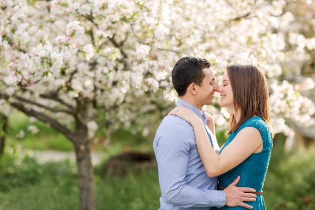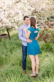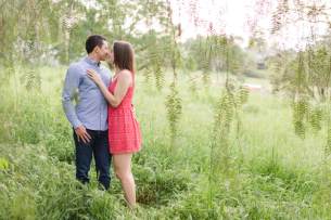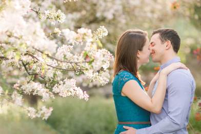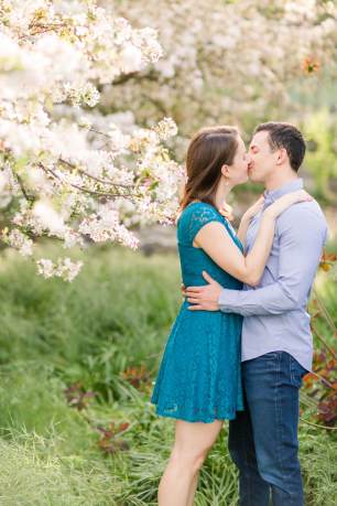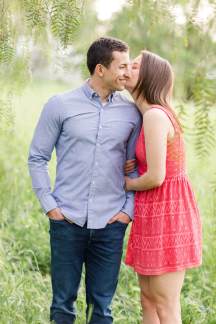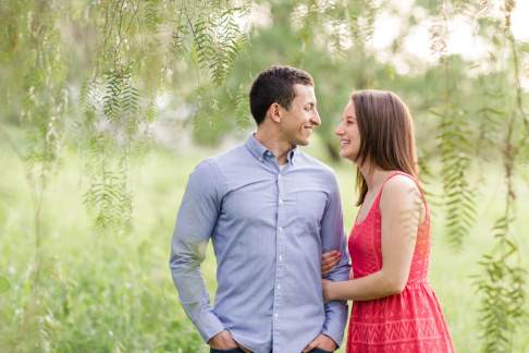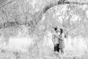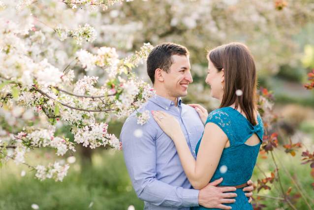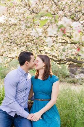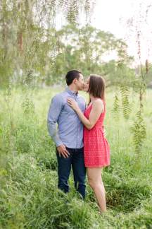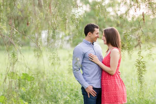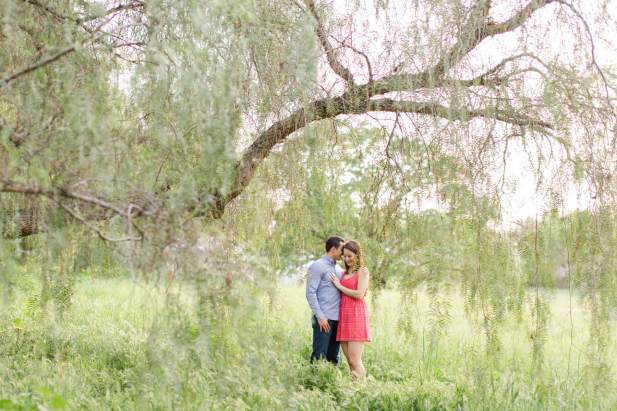 We got lucky with a perfect shaft of light falling on the pink and white trees at the bottom of the garden. When they sat under them the falling leaves made everything so magical! There were so many spots where the flowers had just started to bloom and tall grasses popped up from all the rain we’ve been having lately. The blooms were so wonderful to work with and made a fabulous backdrop for Samantha’s stunning and sparkly engagement ring. For the second part of their session, we went out to the main park to the willow trees to catch the last bit of glowy sunset light. The outfits they picked out were perfect and the colors they picked really make them pop off the background!