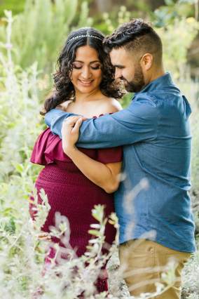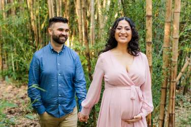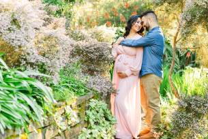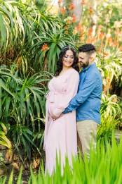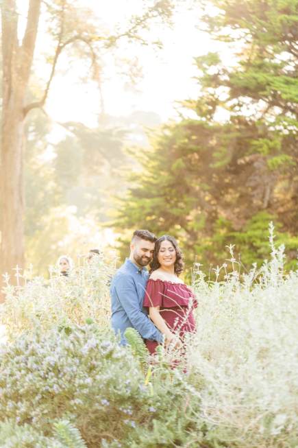 Soon-to-be parents, Cynthia & Spencer, were absolutely glowing during their maternity session at the SF Botanical Gardens. It’s hard to believe that this was shot in the middle of January. The weather was so beautiful and warm in the City. Flowers had just begun to bloom and in the South African section of the grounds, there were even gorgeous pink flowers that complemented Cynthia’s gorgeous dress perfectly. The sun was shining brightly and the gardens was filled with sunbeams and golden light. It was such a perfect backdrop for these two (soon to be three!).